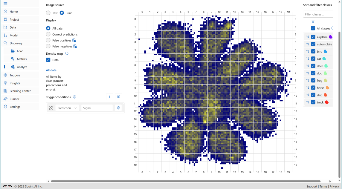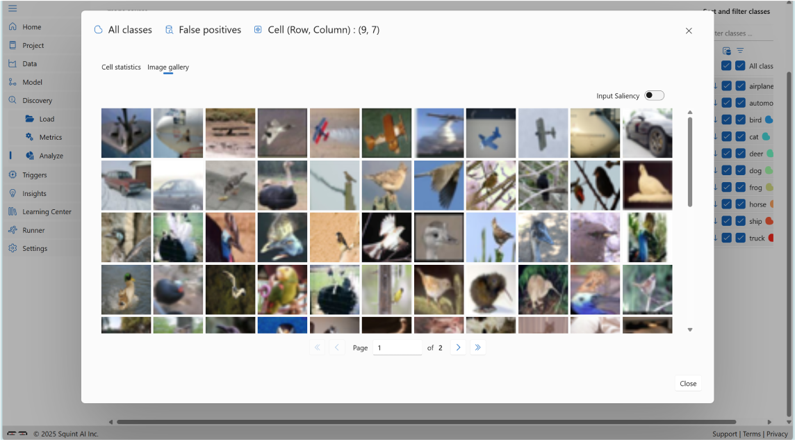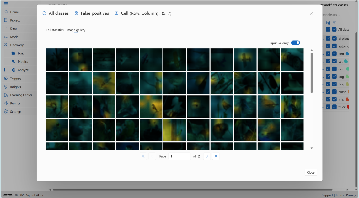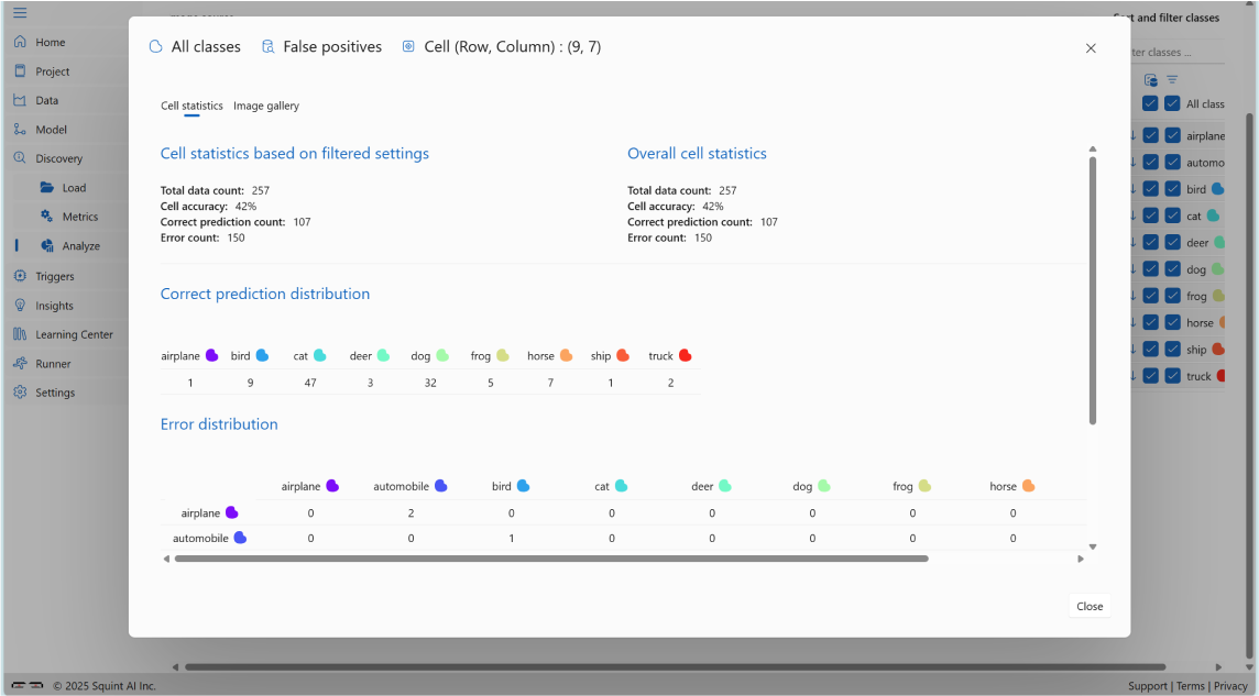 This sample project demonstrates how to use Squint Vision Studio to evaluate a model trained on the CIFAR-10 datasource. By following these steps, you can gain deep insights into your model's performance, understand its decision-making process, and identify areas for improvement.